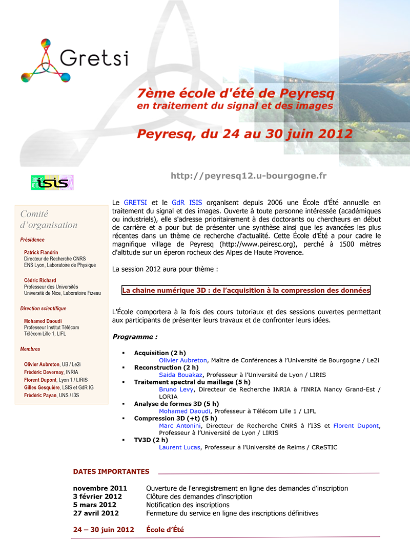 L'objectif de cette école est de donner une couverture de l'état de l'art des étapes présentes dans une chaîne de numérisation d’objets 3D : acquisition, reconstruction/modélisation, traitement/analyse, et compression. Plus précisément, ces cours veilleront à: