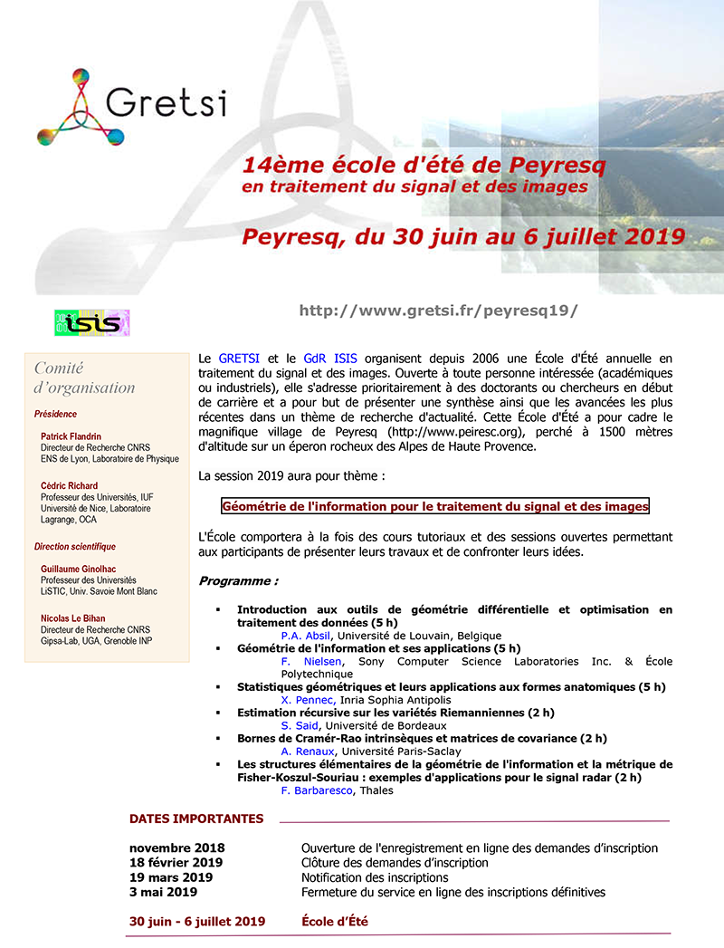 La géométrie de l’information est un thème qui a généré une activité croissante dans la communauté signal et images. Parmi les thématiques incluses dans la géométrie de l’information, on compte par exemple : la définition de distances ou divergences sur des espaces courbes et les applications en classification, les statistiques sur les groupes et les variétés avec des applications en tracking, filtrage et estimation; ainsi que la caractérisation des performances des estimateurs de matrices de covariance. Le nombre des applications est croissant et les potentialités importantes, mais il faut constater que les méthodologies et concepts impliqués en géométrie de l’information ne font pas partie de beaucoup de cursus. Cette École d’Été envisage de proposer aux doctorants (en priorité) une introduction aux concepts de la théorie (géométrie différentielle) ainsi qu’un état des lieux de leurs applications en traitement des signaux et des images.
