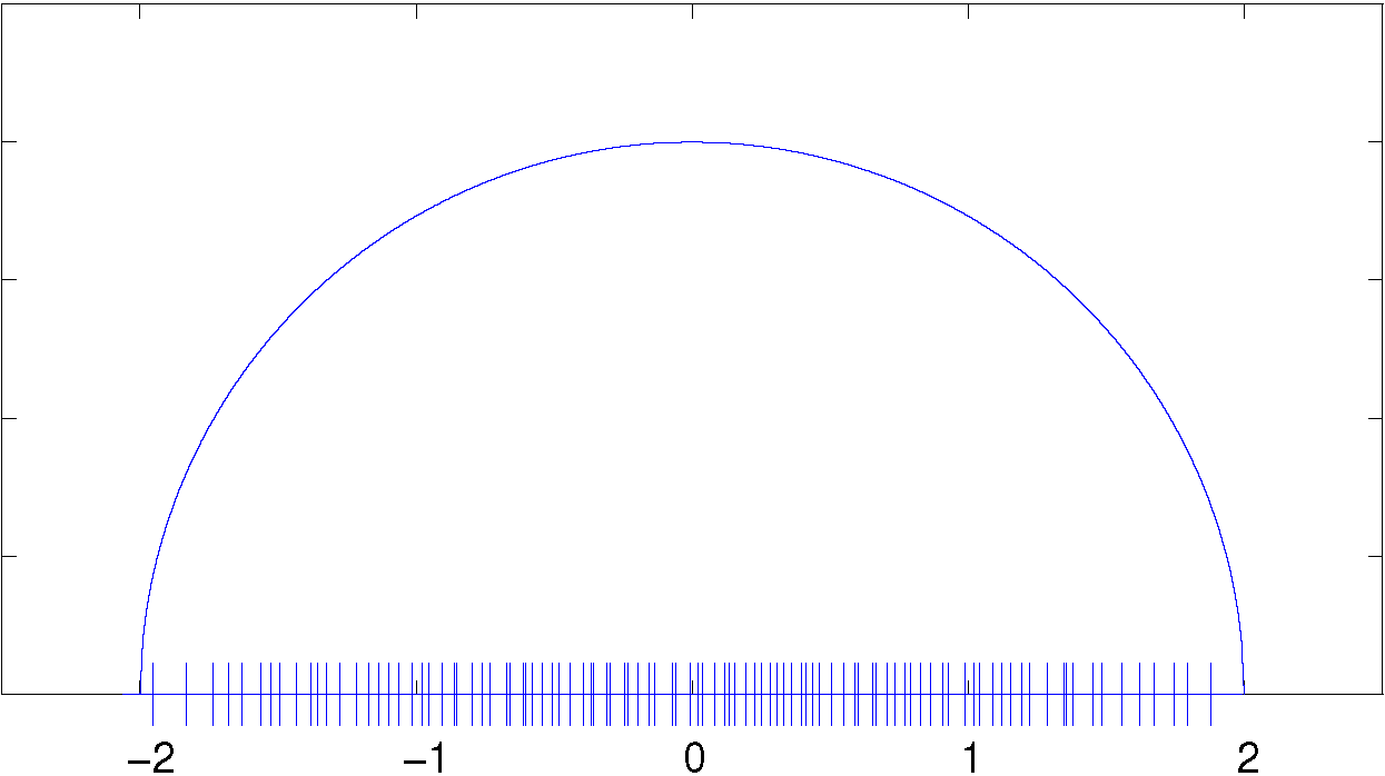 la mesure de probabilité aléatoire appelée la mesure spectrale de la matrice \(N^{-1/2}X\), Wigner a établi que \(\mu_N\) convergeait étroitement vers la mesure de probabilité déterministe dite la loi du demi cercle supportée par l'intervalle \([-2,2]\) (cf. figure 1.a).