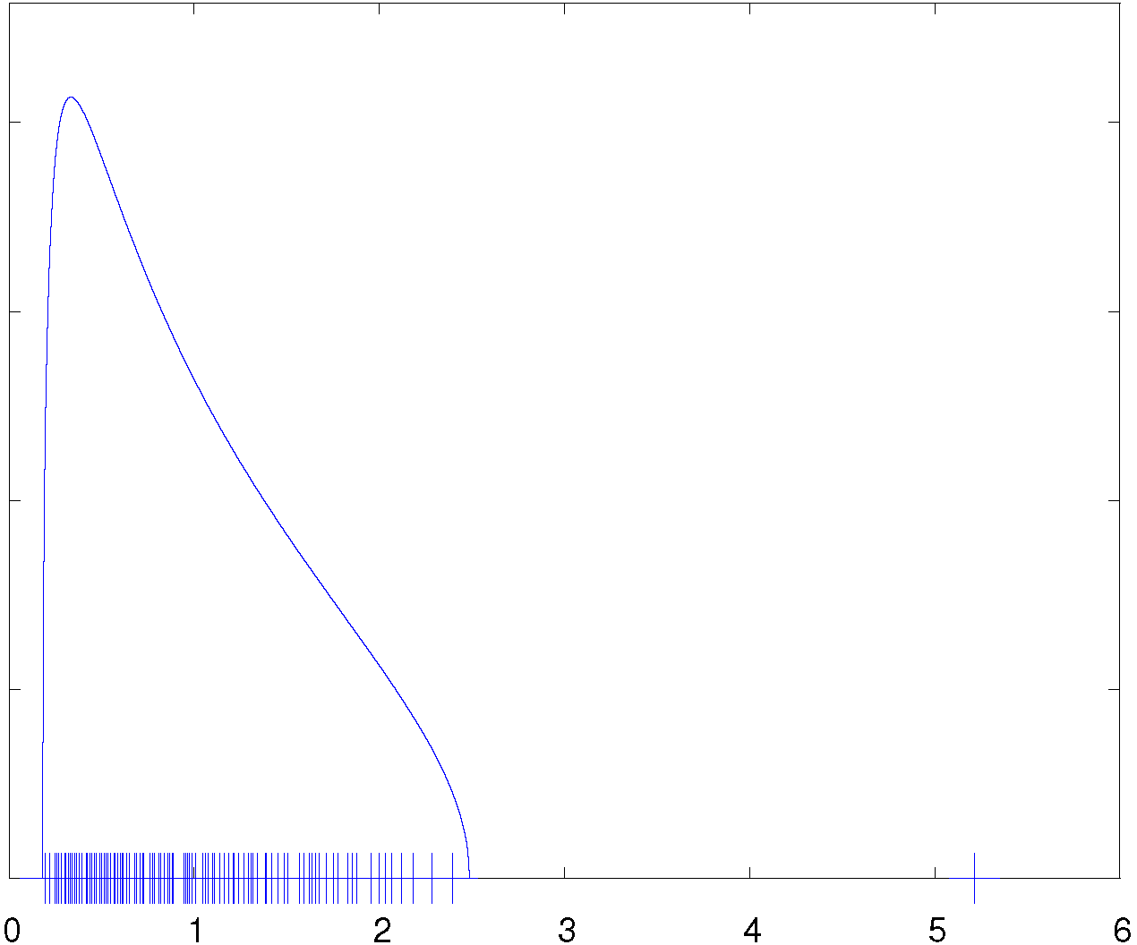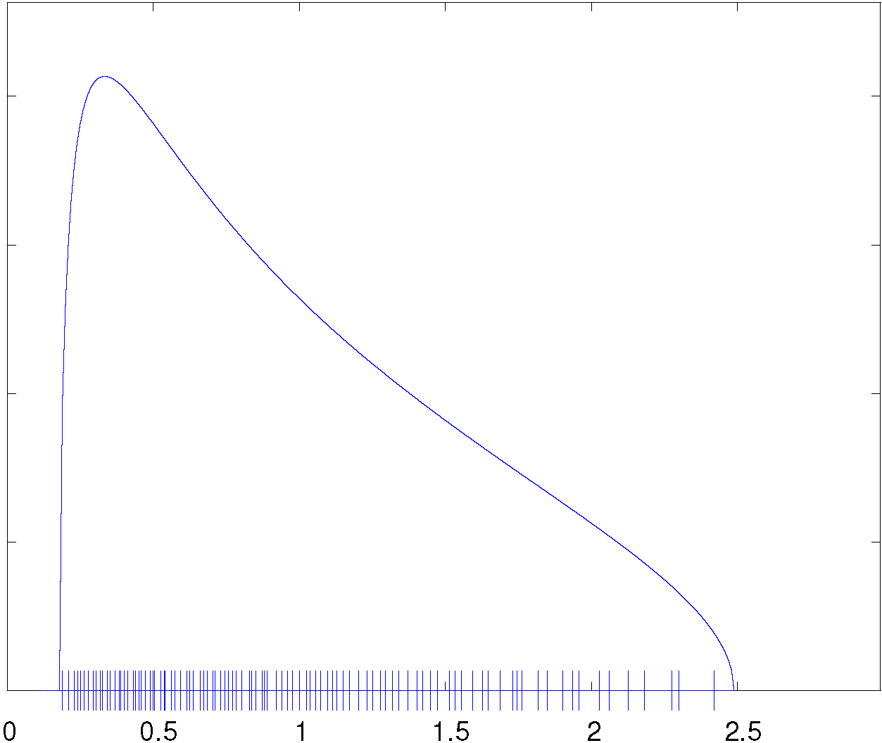 Marchenko et Pastur se sont intéressés à la situation plus complexe où \(N,n \to\infty\) de manière que \(N/n\) tende vers une constante \(c > 0\). Dans ce nouveau régime asymptotique, il demeure vrai que \(\Sigma\) converge vers \(I_N\) élément par élément par la loi des grands nombres, mais le comportement spectral de cette matrice change radicalement. Dans ce nouveau régime, la mesure spectrale \(\mu_N\) converge étroitement vers une nouvelle mesure de probabilité. Sur l'intervalle \(]0,\infty[\), cette mesure possède une densité supportée par l'intervalle \([(1-\sqrt{c})^2, (1+\sqrt{c})^2]\) (figure 1.b) et qui admet une expression explicite. Comme pour le cas de la matrice de Wigner, la convergence vers la loi de Marchenko-Pastur est universelle dans le sens où elle est vraie indépendamment de la loi des éléments de \(X\).
