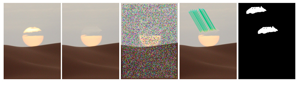 La sécurisation de données multimédia peut être abordée de manière passive ou active par insertion de données cachées (tatouage, stéganographie, …) ou par cryptographie (chiffrement sélectif, signature perceptuelle, …). Cela concerne principalement la confidentialité, l’authentification, l’intégrité et la protection des droits d’auteur. L’autre versant consiste à détecter si un message est caché dans une image (stéganalyse) ou si une image a été manipulée (image forensics/criminalistique). Dans cette partie sont abordées les problématiques de traçabilité de contenus multimédia et de détection de falsifications telles que des copier-déplacer dans une image ou des copier-coller d’une image vers une autre. Dernièrement il est apparu des aspects liés à la phylogénie des images qui consistent à partir d’un ensemble d’images très similaires (récupérées sur des réseaux sociaux par exemple) afin de retrouver qui est le parent de qui et ensuite de remonter à l’image source. Il existe aussi des méthodes d’identification d’appareils photo numériques à partir d’analyse de bruit et de distorsion contenus dans une image.